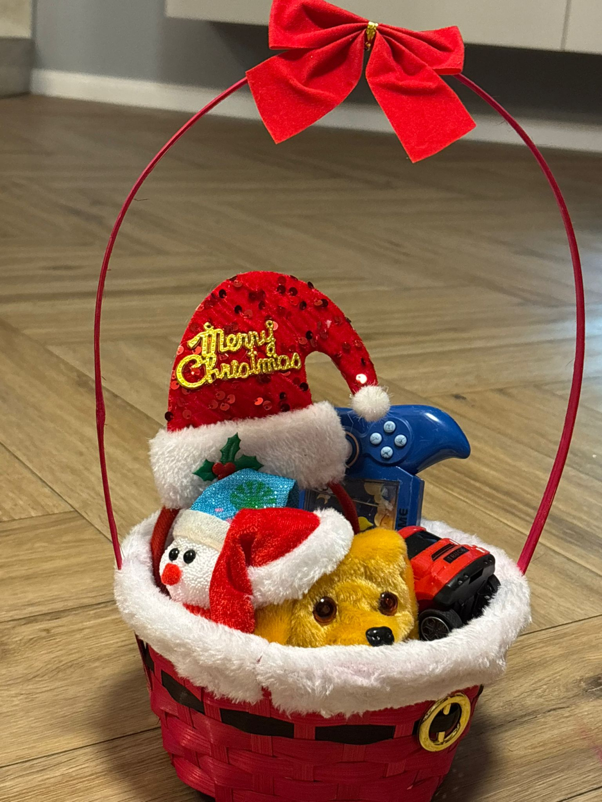 Acest minunat coșuleț cadou de Crăciun pentru copii este gândit special pentru a aduce bucurie încă de la prima vedere! Realizat într-un coș roșu festiv, decorat cu blăniță albă și o fundă mare elegantă, coșulețul conține jucării adorabile potrivite pentru sărbători: un animăluț de pluș îmbrăcat în Moș Crăciun, un ornament drăguț de Crăciun, o jucărie tip figură moale și mici surprize tematice care încântă orice copil.