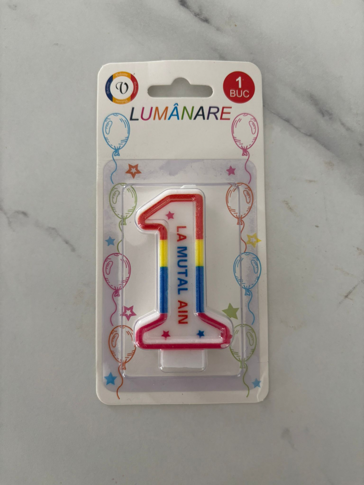 Celebrează primul an de viață într-un mod festiv cu această lumânare aniversară în formă de cifra 1. Modelul este decorat în culorile tricolorului și inscripționat cu urarea „La mulți ani!”, aducând un plus de veselie tortului și atmosferei de sărbătoare.